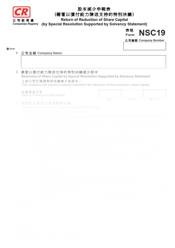 2016年香港表格NSC19 – 股本減少申報表(藉著以償付能力陳述支持的特別決議)