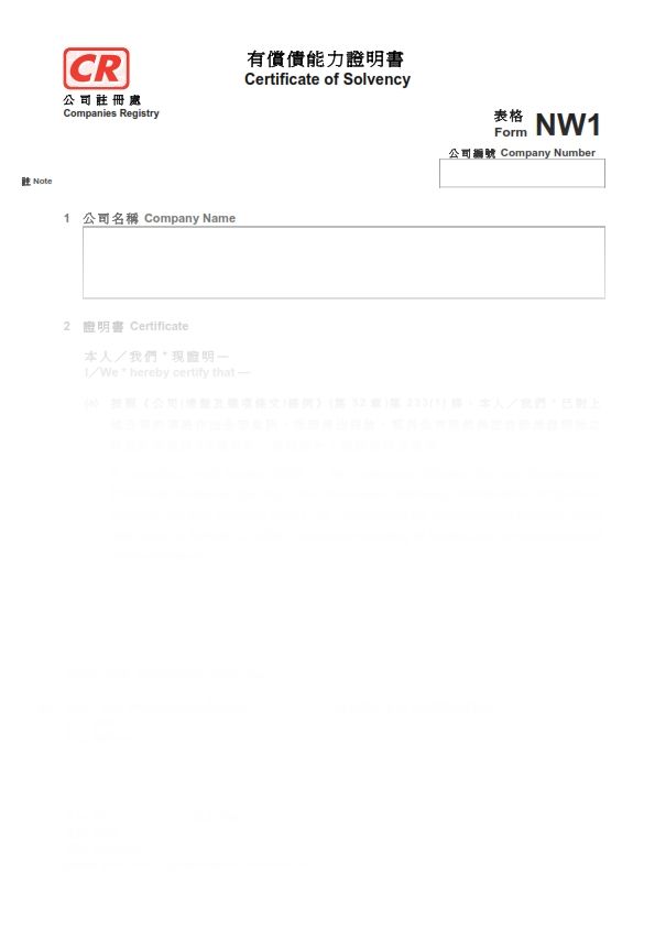 2016年香港表格NW1 – 有償債能力證明書