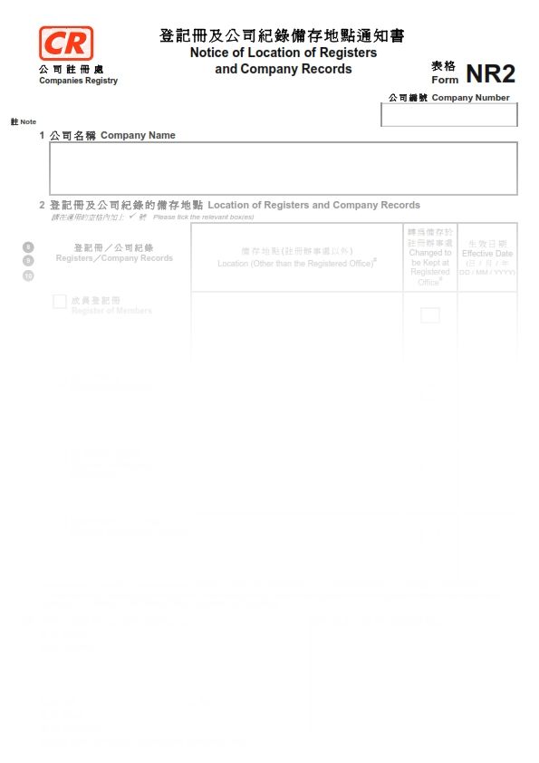 2016年香港表格NR2 – 登記冊及公司紀錄備存地點通知書